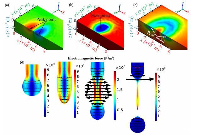 圖1電磁力分布:(a—c)熔池內(nèi)部笛卡爾坐標(biāo)系x、y、z方向;(d)熔滴內(nèi)部