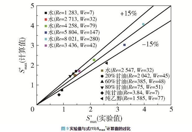圖9為Smax*實(shí)驗(yàn)值與式(15)的Smax*計(jì)算值的對(duì)比,式(15)的Smax*計(jì)算值與實(shí)驗(yàn)值誤差在大部分情況下都小于15%,因此在75 < Re < 9000,7 < We < 300時(shí),可使用式(15)預(yù)測(cè)液滴撞擊不銹鋼固體表面的最大鋪展面積。