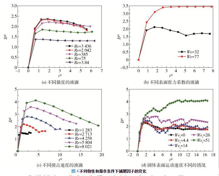 若一個(gè)具有初始球形當(dāng)量直徑D0以及初始面積S0的液滴在撞擊過(guò)程中經(jīng)過(guò)鋪展時(shí)間t后的鋪展直徑為D,鋪展面積為S,且此時(shí)鋪展線速度為U,則定義相應(yīng)的無(wú)量綱鋪展因子D*、無(wú)量綱鋪展速度U*、無(wú)量綱鋪展面積S*和無(wú)量綱鋪展時(shí)間t*分別為