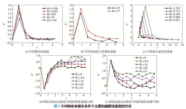 在固體表面水平運(yùn)動(dòng)時(shí),定義液滴上游方向?yàn)橐旱武佌古c固體表面運(yùn)動(dòng)相同的方向,反之為液滴下游方向。如圖5(d)所示,液滴上游鋪展線速度(絕對(duì)值)在撞擊后的短時(shí)間內(nèi)增加到最大值,但由于其方向與固體表面運(yùn)動(dòng)方向相反,隨著固體表面運(yùn)動(dòng)速度的增大,液滴受到的黏性力增大,且上游鋪展線速度降低。液滴上游鋪展線速度降至0之后,黏性力與上游鋪展線速度的方向開(kāi)始相同,此時(shí)黏性力作正功,因此固體表面運(yùn)動(dòng)速度的增大會(huì)使得上游鋪展線速度增大,直至上游鋪展線速度與表面運(yùn)動(dòng)速度相等。如圖5(e)所示,在撞擊的瞬間,液滴下游鋪展線速度大于表面的運(yùn)動(dòng)速度,此時(shí)黏性力做負(fù)功,且下游鋪展線速度會(huì)逐漸減小至固體表面運(yùn)動(dòng)速度。