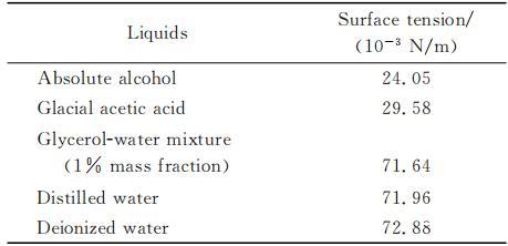 由于本文研究液體張力變化對固壁面近旁空泡生長和潰滅過程的影響,因此所用液體的粘滯系數μ及密度ρ應大體相近,在空氣中的表面張力應有較大差異。實驗采用5種液體,其表面張力如表1所示。