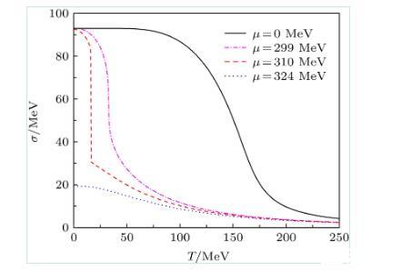圖1在不同夸克化學(xué)勢(shì)密度條件下,σ場的真空期望值隨溫度的演化行為