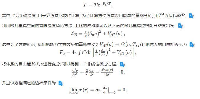 在偽真空的環(huán)境下,大小不一的真真空泡泡,由于量子漲落和熱漲落隨機(jī)出現(xiàn)并消失,直至泡泡的半徑大于等于臨界半徑,然后這些泡泡就會(huì)一直膨脹下去,完成一級(jí)相變的相變過程,并把多余的體系自由能以相變潛熱的形式釋放到環(huán)境中?;谶@個(gè)機(jī)制,單位時(shí)間單位體積的臨界泡泡成核率可以表示為