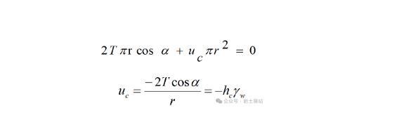 來自《土力學》式中,水膜張力T與溫度有關,單位:N/cm或KN/m;10°時,T=7.41×10-4N/cm=7.41×10-5KN/m;方向與毛細管成夾角α,該角度的大小與土顆粒礦物成分和水性質有關;