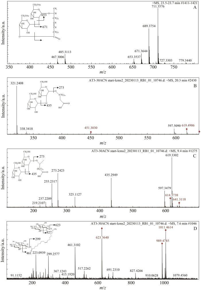 圖2(A)乙酰化SLs保留時間為23.6 min組分的質譜圖.(B)去乙酰化SLs保留時間為20.3 min組分的質譜圖.(C)去乙酰化SLs保留時間為9.4 min組分的質譜圖.(D)去乙酰化SLs保留時間為7.6 min組分的質譜圖