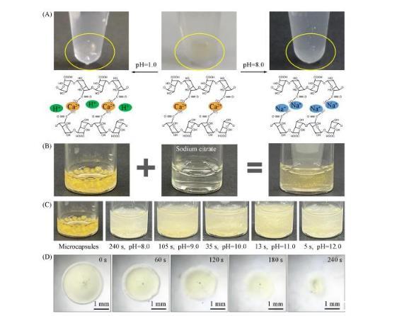 所制備的水/水微囊具有良好的生物相容性、尺寸均一性及較高的包裹率和裝載率,是各種活性物質(zhì)的理想載體,并且能夠對pH變化做出響應,實現(xiàn)可控釋放。如圖5(A)所示,水/水微囊的殼層是由二價鈣離子交聯(lián)的海藻酸鈉水凝膠組成,在酸性環(huán)境下具有良好的穩(wěn)定性,但在堿性環(huán)境下海藻酸鈉水凝膠與二價鈣離子的結合能力變?nèi)酰宦?lián)網(wǎng)絡被破壞,從而釋放內(nèi)核活性物質(zhì)。如果在溶液中加入檸檬酸鈉,二價鈣離子更傾向于與檸檬酸根結合,從而破壞交聯(lián)網(wǎng)絡,也可以溶解水/水微囊。如圖5(C)所示,水/水微囊的溶解速率隨pH的增大而提高。當水/水微囊的囊壁被溶解后,內(nèi)核物質(zhì)逐漸被釋放出來,展現(xiàn)出良好的pH響應性和可控釋放。