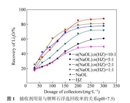 圖1捕收劑用量與鋰輝石浮選回收率的關系(pH=7.5)