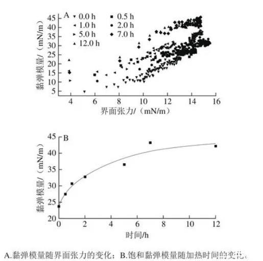 圖3纖維化過程中β-乳球蛋白在油水界面的吸附動力學過程(A)及其飽和界面張力(B)的變化