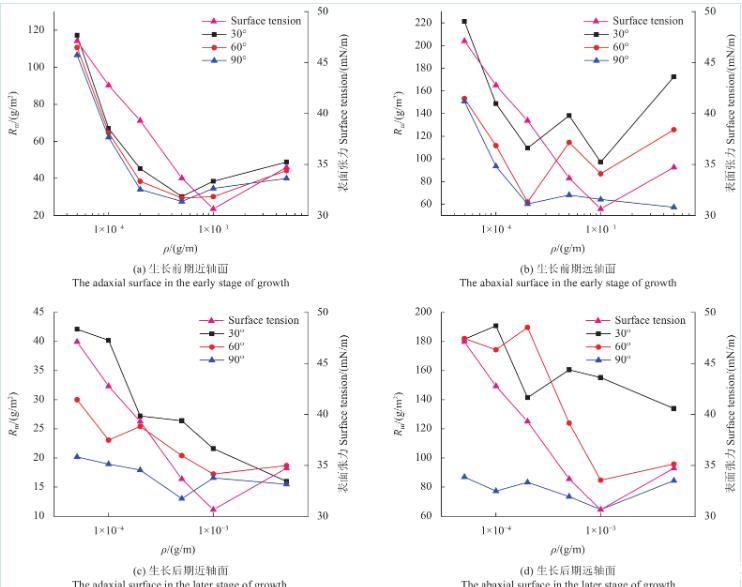 圖5為不同質(zhì)量濃度Triton X-100溶液在蘋果葉片近、遠(yuǎn)軸面的Rm變化規(guī)律。從中可以看出,不同傾角下蘋果葉片生長(zhǎng)前期近、遠(yuǎn)軸面的Rm值和表面張力均隨溶液質(zhì)量濃度的升高而不斷減小,當(dāng)Triton X-100溶液質(zhì)量濃度達(dá)到cmc時(shí),近軸面Rm值與表面張力的變化趨于平緩,而遠(yuǎn)軸面的Rm值則出現(xiàn)大幅波動(dòng)。其原因可能與Triton X-100表面活性效率高(cmc=1.32×10?4 g/mL)有關(guān),同時(shí)溶液色散分量占比會(huì)隨溶液質(zhì)量濃度的升高而提高,而對(duì)蘋果葉片遠(yuǎn)軸面表面自由能起主導(dǎo)作用的也是色散分量,以上多重因素導(dǎo)致遠(yuǎn)軸面的Rm值產(chǎn)生波動(dòng)。蘋果葉片生長(zhǎng)后期Rm與表面張力隨溶液質(zhì)量濃度的變化與生長(zhǎng)前期相似。