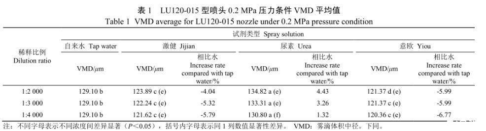 注:數(shù)字后不同字母表示同1行不同溶液間差異顯著(<0.05),括號內(nèi)字母表示同1列數(shù)值顯著性差異(<0.05)。VMD:霧滴體積中徑。下同。