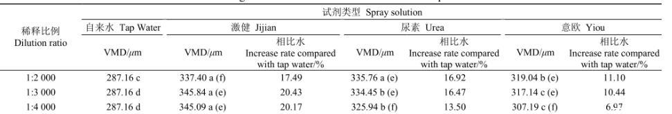 表3為霧滴體積中徑試驗結果,結果顯示,與水相比,3種助劑均呈現增大霧滴體積中徑趨勢。激健助劑在1:2 000稀釋比例下溶液與其余2種配比溶液之間存在顯著性差異。尿素與意歐助劑在1:4 000稀釋比例下溶液與其余2種配比溶液之間對應存在顯著性差異。此結果說明,3種助劑在與水混合后霧化效果相對穩定。不同稀釋比例下,激健溶液與水相比霧滴體積中徑增大17%~20%,尿素溶液增大13%~17%,意歐溶液增大7%~11%。尿素與意歐溶液對霧滴體積中徑影響均呈現隨溶液濃度降低影響效果減弱趨勢。