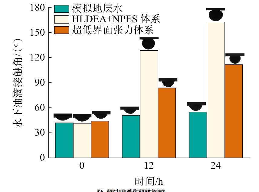 通過評價表面活性劑體系在親油巖心表面的潤濕性來考查體系潤濕調(diào)控能力,實驗結果如圖5所示。從圖5可知,地層水可較微弱地改變親油巖心表面潤濕性,但表面仍為親油表面。超低界面張力體系作用下,可在24 h內(nèi)將表面水下油滴接觸角由43.98°改性到111.35°。調(diào)控界面潤濕性效果最為顯著的是HLDEA+NPES體系,24 h內(nèi)水下油滴接觸角由41.34°增至162.53°,實現(xiàn)強親水改性。
