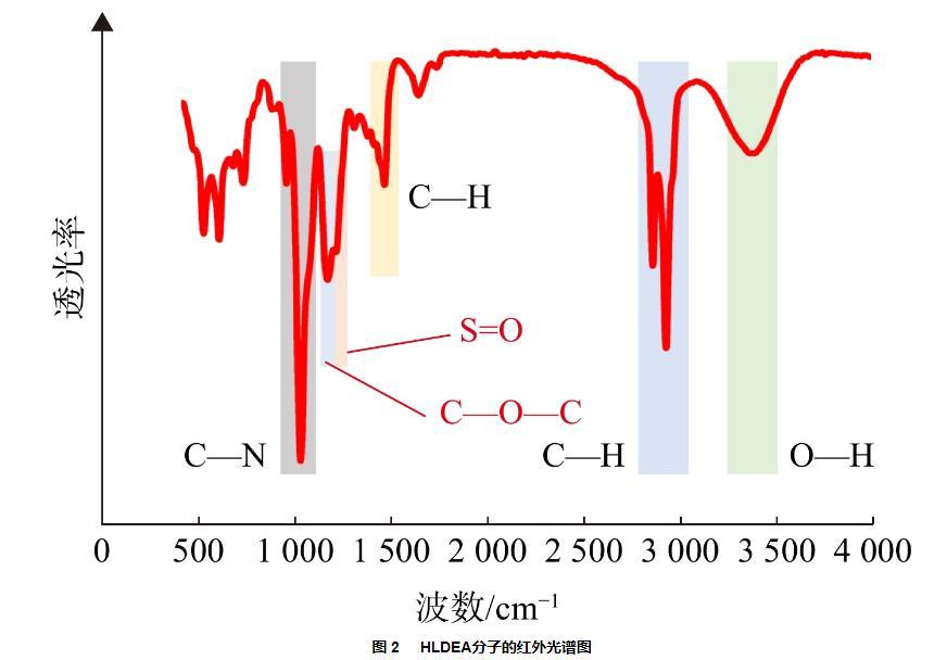紅外光譜中峰的位置及形狀與分子中鍵的種類和環(huán)境具有對應關系,通過分析所得譜圖可得到物質(zhì)的化學和結構組成的相關信息。圖2所示為HLDEA分子的紅外光譜圖。由圖2可知,合成后的HLDEA在3354.44 cm?1處出現(xiàn)O—H鍵的伸縮振動峰,2921.96 cm?1和2852.77 cm?1處的雙峰代表C—H鍵的伸縮振動峰,1463.05 cm?1處出現(xiàn)C—H鍵的彎曲振動峰,1028.50 cm?1處出現(xiàn)C—N鍵的伸縮振動峰,1215.97 cm?1處出現(xiàn)了S=O鍵的伸縮振動峰及1168.25 cm?1處C—O—C鍵的伸縮振動峰。C—O—C鍵和S=O鍵對應的振動峰來自生成的醚鍵和引入的磺酸根,這兩處峰的存在證明了反應成功發(fā)生,磺酸基團被接到LDEA分子上。