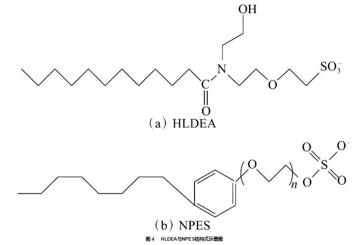 將配制好的穩(wěn)定性優(yōu)異的復配體系[0.15%(w)HLDEA+0.15%(w)助表面活性劑]置于75℃條件下,測定復配體系的油水界面張力,結果見圖3。由圖3可得,復配后體系油水界面張力隨時間均出現(xiàn)先下降后基本保持平衡的趨勢。HLDEA與兩種陰非離子型表面活性劑APEC-4Na和NPES復配后體系的油水界面張力降低至接近超低界面張力水平(10?3 mN·m?1)。這是因為HLDEA分子小、親油性高,其擴散速度快且傾向于進入油滴內(nèi)部,同時,溶液中的NPES分子隨時間推移逐步被吸引于油水界面,尾鏈與HLDEA分子相互糾纏形成緊密結構,提高了油水界面吸附膜的致密程度,從而使界面張力大幅降低。最終優(yōu)選出的助表面活性劑為NPES,在與HLDEA復配后體系界面張力值為3.8×10?3 mN/m。HLDEA與NPES結構式見圖4。作為對比的超低界面張力體系油水界面張力值為2.9×10?4 mN/m,較HLDEA+NPES體系界面張力低了一個數(shù)量級。