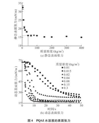 因此,本文采用芬蘭Kibron公司的表面張力儀在20一22℃下研究了溶液的界面性質,如靜態(tài)和動態(tài)表面張力。不同PQAI溶液的靜態(tài)表面張力的變化如圖4(a)所示。可以看出,在去離子水中加人少量表面活性劑,溶液的表面張力急劇下降。然而,在質量濃度>0.04kg/m2時,下降趨勢開始緩慢。這意味著PQAI水溶液的pcMc~0.04kg/m2,此時表面活性劑水溶液靜態(tài)表面張力為16.07mN/m。