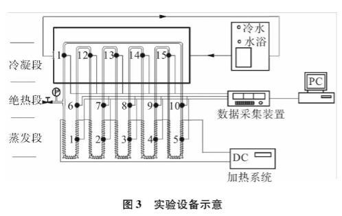 脈動熱管由外徑4 mm、內徑2 mm,經氧乙炔正火處理后銅毛細管彎曲而成。圖3示出了脈動熱管實驗設備的示意圖。用誤差傳播法分析了實驗裝置的不確定性。電壓電流精度為1%。本文中最小電壓和電流分別為17.9V和1.7A。此外,熱電偶的不確定度為0.1℃。在蒸發(fā)器和冷凝器的最小溫差為45℃時,熱阻的最大相對不確定度為4.47%。