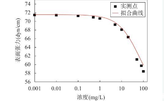 在0.01mol/L氯化鈉溶液中測量所得的6∶2氟調磺酸表面張力如圖1所示,圖中實心點表示同一濃度下表面張力的實際平均值,曲線是基于Szyszkowaki方程擬合所得。利用該方程擬合的相關參數A和B的值分別為12.70和0.075。實驗結果顯示實測數據點與擬合曲線偏移量較小,這證實了Szyszkowaki方程對本實驗體系的表面張力數據具有良好的擬合效果。