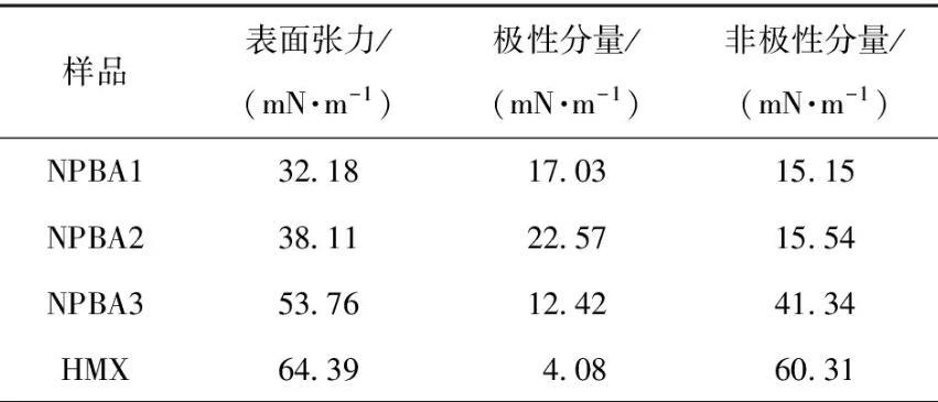 采用動態接觸角測試儀的Wilhelmy吊片法和Modified washburn法,分別測試了合成的3種NPBA和HMX在不同液體中的接觸角θ,結果見表3.