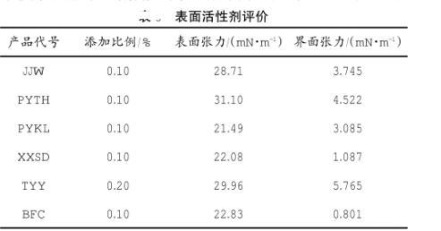 由表2可知,3種表面活性劑均具有較好的降低表面張力效果,在較低濃度時就達(dá)到了較低表面張力,且隨著濃度的增加表面張力趨于平穩(wěn);3種表面活性劑按降低表面張力性能由高到低排序依次為PYKL、XXSD和BFC。