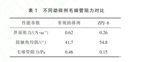 毛細(xì)管力的作用使流體流動阻力增加,導(dǎo)致壓裂后壓裂液返排困難。如果地層壓力不能克服毛細(xì)管力,壓裂液濾液和殘渣吸附在裂縫表面,造成儲層孔隙堵塞和壓裂液無法返排,就會致使?jié)B透率降低,傷害儲層。為了減少壓裂液在地層的停留時間,須使用助排劑,降低壓裂流體的表面張力。以降低油水相間界面張力、增大與巖心表面接觸角兩方面為目標(biāo),選取不同助排劑進(jìn)行對比(見表1),優(yōu)選出具有較佳界面張力與接觸角平衡值的新型助排劑ZPJ-6。與常規(guī)產(chǎn)品相比,新型助排劑具有較低的界面張力和較高的接觸角,毛細(xì)管阻力相對減小。