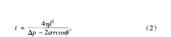 表示。式中,σ為表/界面張力,r為孔隙平均半徑,θ為潤(rùn)濕角。因此,對(duì)于特定的儲(chǔ)層,破膠液表/界面張力越低且與巖石接近中性潤(rùn)濕則返排能力越強(qiáng)。同時(shí),根據(jù)Poiseulle方程,當(dāng)返排壓差為Δp時(shí),從半徑為r、長(zhǎng)為l的毛細(xì)管中排出黏度為η、表/界面張力為σ和接觸角為θ的液體所需時(shí)間