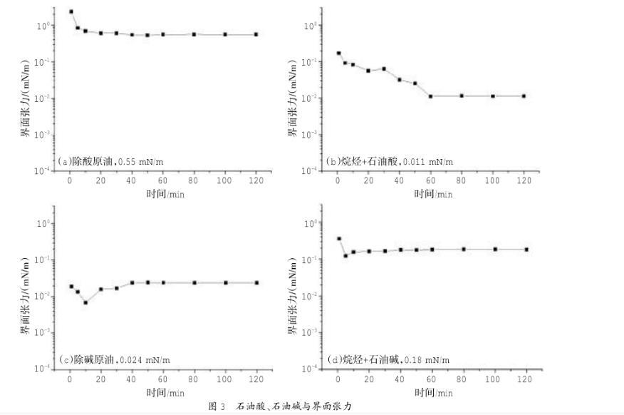 為研究遼河石油酸、石油堿與界面活性之間的關系,首先測量了遼河兩性表面活性劑與原油之間的界面張力,為0.005 2 mN/m,可以超低;也測量了表面活性劑與烷烴之間的界面張力,為1.38 mN/m,界面活性較差;在此基礎上考察石油酸、石油堿對降低界面張力的貢獻。由圖3可以看出,在原油剔除石油酸組分后,界面張力由超低陡然升高至0.55 mN/m,說明石油酸組分對超低界面張力的形成具有非常重要的作用,也說明在遼河油田的兩性表面活性劑二元復合驅中,石油酸組分依然發揮著原油活性物質的作用;在烷烴組分添加石油酸后,界面張力由1.38 mN/m降低至0.011 mN/m,兩個數量級的降低,進一步說明石油酸組分與遼河兩性表面活性劑之間具有明顯的相互作用,是有效降低界面張力的重要原油組分。