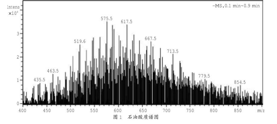(1)萃出石油酸組分含量為3.88%,相對分子質主要分布在400~900,碳數對應C27~C62,結構以環烷酸為主;