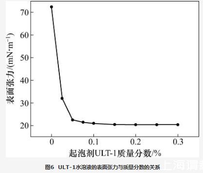 當起泡條件相同時,起泡劑水溶液的表面張力越低,發(fā)泡體積越高。配制一系列濃度梯度的起泡劑ULT-1水溶液,利用接觸角/表面張力測量儀采用懸滴法測量表面張力與起泡劑ULT-1質(zhì)量分數(shù)的關(guān)系,結(jié)果如圖6所示。從圖6可知:當起泡劑ULT-1質(zhì)量分數(shù)小于0.05%時,表面張力隨起泡劑ULT-1質(zhì)量分數(shù)的提高快速降低;當起泡劑ULT-1質(zhì)量分數(shù)大于0.05%時,表面張力降幅越來越小;當起泡劑ULT-1質(zhì)量分數(shù)提高至0.2%時,表面張力降至20.40 mN/m,較蒸餾水降低了71.82%,繼續(xù)提高起泡劑ULT-1的質(zhì)量分數(shù),表面張力不再降低。表明新型起泡劑ULT-1在較低濃度時即達到較低的表面張力,有利于提高發(fā)泡體積。