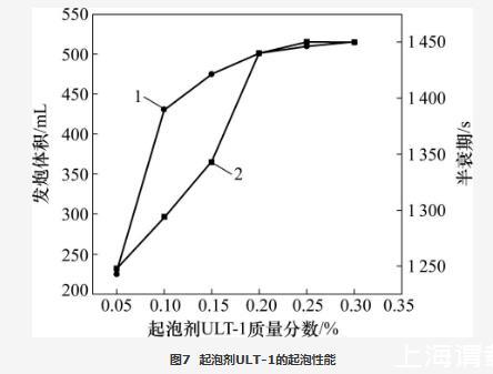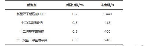 起泡性能主要是指起泡能力和泡沫穩(wěn)定性。發(fā)泡體積V0反映了起泡能力,析液半衰期t1/2反映了泡沫穩(wěn)定性。在室溫下,稱取一定質(zhì)量的起泡劑ULT-1于攪拌杯中,加入100 mL蒸餾水,置于攪拌器之上,以轉(zhuǎn)速11 000 r/min攪拌1 min。攪拌完畢后,立即取下攪拌杯,同時啟動秒表,開始記錄消泡時間,將攪拌杯中的所有物質(zhì)全部倒入1 000 mL量筒中,讀取發(fā)泡體積和從泡沫中析出50 mL液體的時間,即為半衰期。通過改變起泡劑ULT-1的質(zhì)量測量起泡性能與起泡劑質(zhì)量分數(shù)的關(guān)系,結(jié)果如圖7所示。從圖7可知:隨起泡劑ULT-1質(zhì)量分數(shù)的提高,發(fā)泡體積增加幅度較大,半衰期緩慢增加。當ULT-1質(zhì)量分數(shù)升到0.2%時,發(fā)泡體積達到501 mL,半衰期達到1 440 s,繼續(xù)提高質(zhì)量分數(shù)發(fā)泡體積和半衰期基本不變,表明研制的新型起泡劑ULT-1低濃度時即具有較高的起泡性能,發(fā)泡體積高,泡沫半衰期長。同時,對比評價了常用起泡劑的半衰期,結(jié)果如表1所示。從表1可知:質(zhì)量分數(shù)為0.2%的起泡劑ULT-1與質(zhì)量分數(shù)為0.5%的常規(guī)起泡劑相比,泡沫半衰期可提高3倍以上。