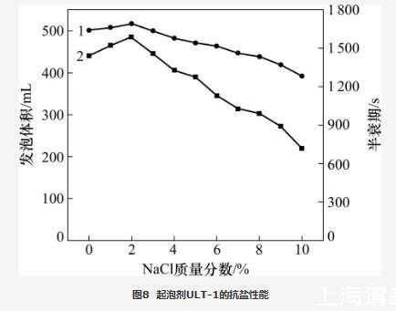 利用抗NaCl污染的能力評價質(zhì)量分數(shù)為0.2%起泡劑ULT-1水溶液的抗鹽性能。在室溫下,稱取0.2 g起泡劑ULT-1于攪拌杯中,加入100 mL蒸餾水,置于攪拌器之上,以轉(zhuǎn)速11 000 r/min攪拌1 min。直接加入一定量的NaCl,以轉(zhuǎn)速11 000 r/min攪拌1 min,測量發(fā)泡體積和半衰期。通過改變NaCl的質(zhì)量分數(shù)測量起泡性能,結(jié)果如圖8所示。從圖8可知:當NaCl質(zhì)量分數(shù)在2%以內(nèi)時,發(fā)泡體積和半衰期緩慢增大,當NaCl質(zhì)量分數(shù)繼續(xù)增大時,發(fā)泡體積和半衰期緩慢降低;當NaCl質(zhì)量分數(shù)達10%時,發(fā)泡體積和半衰期仍能保持較高水平,表明研制的新型起泡劑ULT-1具有較好的抗鹽性能。