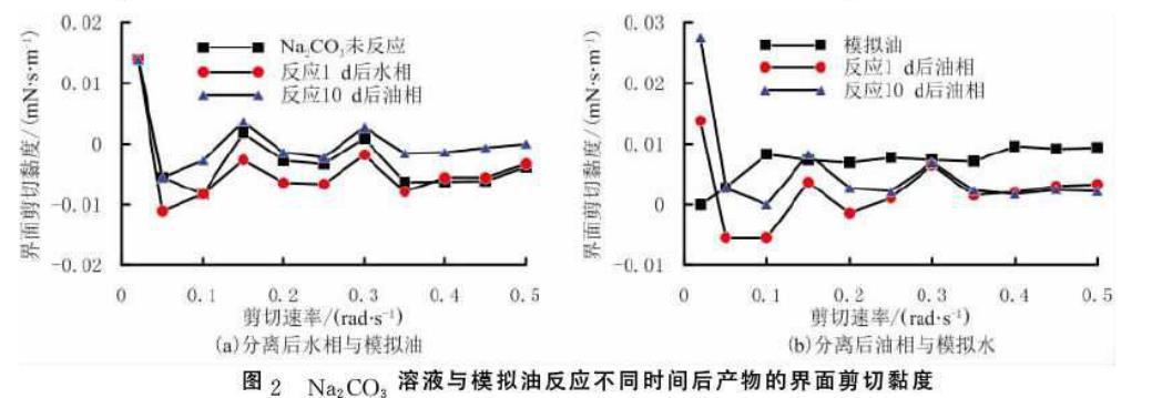 在Na2CO3溶液與模擬油反應1d和10d后,分離得到的水相與模擬油及油相與模擬水的界面剪切黏度隨剪切速率變化關系見圖2.由圖2可以看出,Na2CO3溶液與模擬油反應1d及10d后,分離得到的水相與模擬油的界面剪切黏度,與未反應Na2CO3溶液與模擬油的界面剪切黏度相比變化不大;模擬油與Na2CO3溶液反應1d及10d后,分離得到的油相與模擬水的界面剪切黏度與模擬油與模擬水間的界面剪切黏度相比變化不大,表明Na2CO3溶液與模擬油反應后分離出的水相和油相對油水界面剪切黏度影響不大。原因是模擬油中的有機酸組分與Na2CO3溶液反應所生成的,無論是水溶性還是油溶性的界面活性物質(zhì)均較少,在油水界面處的吸附不足以引起油水界面剪切黏度的變化。