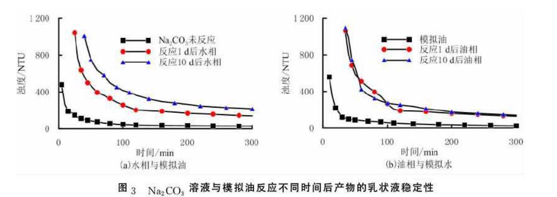 (3)與Na2CO3溶液與模擬油乳化所形成的乳狀液相比,Na2CO3溶液與模擬油反應后的水相與模擬油形成的乳狀液的穩(wěn)定性增強。與模擬油與模擬水乳化所形成的乳狀液相比,Na2CO3溶液與模擬油反應后的油相與模擬水形成的乳狀液的穩(wěn)定性增強。