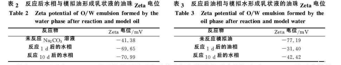由表2可以看出,Na2CO3溶液與模擬油反應后的水相與模擬油形成乳狀液,與Na2CO3溶液和模擬油直接乳化形成的乳狀液相比,油珠Zeta電位絕對值明顯增大;反應10d的與1d的相比,變化很小。這是由于Na2CO3溶液與模擬油反應后生成一些界面活性物質(zhì)溶于水相中,電離后帶負電荷,與模擬油乳化時,帶負電荷的界面活性物質(zhì)吸附在油珠表面上,使油珠表面帶更多負電荷,從而使油珠Zeta電位絕對值增大。隨著反應時間的延長,生成的界面活性物質(zhì)逐漸增多,油珠Zeta電位絕對值也繼續(xù)增大,但增大的幅度很小。