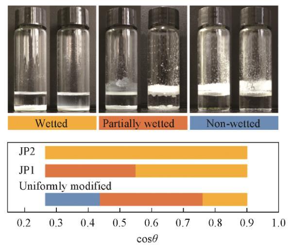 放置在靜止液體表面的顆粒的潤濕行為由圖5示出。隨著液體表面張力的增加,從光滑的氟碳鏈覆蓋的表面獲得的cosθ值同時增大,液體頂部的表面出現明顯的不溶顆粒。這種顆粒不潤濕的情況與顆粒形成粗糙表面測量的結果具有相關性。干燥的顆粒以蓬松狀態直接向油相傾倒,如果在油相表面能形成足夠強壯的、由顆粒組成的亞穩態Cassie-Baxter狀態,那么疏油表面將會形成,并阻止其它顆粒接觸油相,宏觀表現為顆粒不潤濕。相反,如果油相表面由顆粒組成的亞穩態Cassie-Baxter狀態魯棒性不足,在手動振蕩或重力作用下,顆粒或顆粒團聚體接觸油相并浸沒在油相中。亞穩態魯棒性與顆粒表面材料潤濕角密切相關,即不同類型的顆粒具有明顯不同的潤濕轉折點。JP1潤濕性轉折點位于均勻修飾顆粒右側,JP2沒有發現潤濕轉折點。這與顆粒上接枝的烷烴鏈數量有關。JP2上盡管存在氟碳鏈,但由于烷烴鏈覆蓋的面積太大,使顆粒整體表現出強烈的親油性。