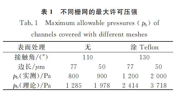 當(dāng)水流過(guò)干燥管道時(shí),表面張力產(chǎn)生的毛細(xì)壓強(qiáng)阻礙水的流動(dòng),此時(shí)的速度-壓強(qiáng)關(guān)系如圖8所示。在圖8的每條曲線上都有一個(gè)轉(zhuǎn)折點(diǎn),且在轉(zhuǎn)折點(diǎn)之后水的流速迅速增加,轉(zhuǎn)折處的壓強(qiáng)被作為毛細(xì)壓強(qiáng)p。對(duì)于這種現(xiàn)象可解釋為在壓強(qiáng)小于毛細(xì)壓強(qiáng)的時(shí)候,水只能在重力作用下極緩慢流動(dòng),由于速度極慢,沿程水頭損失可忽略不計(jì);當(dāng)壓強(qiáng)大于毛細(xì)壓強(qiáng)時(shí),黏性力和壓強(qiáng)差平衡,這時(shí)的流速增加較快。毛細(xì)壓強(qiáng)Pc的實(shí)測(cè)值和理論值如表2所示。水對(duì)于PDMS和壓敏膠的前進(jìn)角都是120°,對(duì)于Teflon涂膜的柵網(wǎng)接觸角是150°(芬蘭Kibron公司生產(chǎn)的Delta-8全自動(dòng)高通量表面張力儀)。實(shí)驗(yàn)結(jié)果與理論計(jì)算一致。