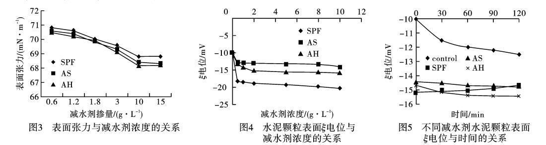 2)SPF對水泥顆粒表面電位穩定性的影響從圖5可知,摻SPF、AS和AH減水劑的水泥顆粒表面起始電位很高,其中加入SPF高效減水劑后電位最大,達到了-15mV,隨著時間的推移摻SPF、AS和AH的水泥顆粒表面電位與起始電位相比有一定的變化,在120min以后,摻SPF減水劑水泥顆粒表面電位與起始電位相比有一定的減小。
