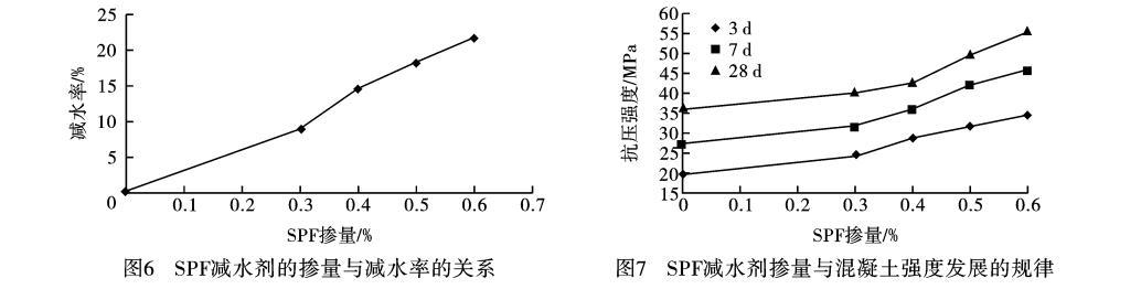 c.SPF高效減水劑應用性能研究表明,隨著摻量的增大,減水率有成比例增加的趨勢,低摻量下即具有較強的減水分散效果,繼續增加摻量后減水率處于平緩狀態。摻加SPF高效減水劑對混凝土有明顯的增強作用,隨著減水劑摻量的增加,不同齡期的抗壓強度都在增加,同時混凝土早期強度發展很快,3d的強度可達到28d強度的60%—70%,7d強度可達到28d強度的80%—90%,混凝土后期強度也有增長的趨勢。