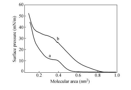 2種單體分子結構相似,CO2DA比CODA多了一CH?-CH?O一柔性間隔基,整個分子的舒展程度相對較大。當CODA分子在水面鋪展時,與水分子的相互作用小,分子"平躺"在水面上,當膜障壓縮單分子膜時,CODA分子受到側向壓力時容易發生滑移,形成多層膜。而CO2DA分子端基親水性相對較強,當膜障壓縮單分子膜時分子在水面能立起來,并與液面形成一定的夾角。因此CO2DA單分子膜占據面積較大,崩潰壓較高。