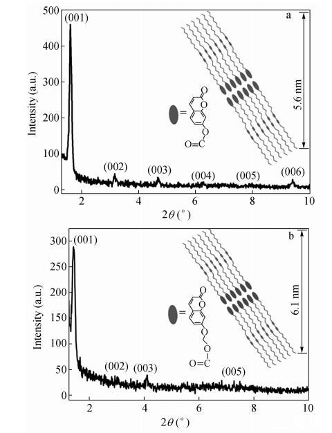 在2θ=2°~10°范圍內出現的多個等距離Bragg衍射峰表明得到的CODA和CO2DA LB膜具有很好的周期性結構。假定從左至右Bragg衍射峰依次為(001),(002),...,(006),用Bragg方程對各級衍射峰進行計算可得CODA和CO2DA LB膜層狀結構間距為5.6nm和6.1nm。CO2DA LB膜的Bragg衍射峰較寬,強度較弱,Bragg衍射峰隨角度的增大衰減很快,說明CO2DA LB膜中分子排列較CODA LB膜中松散,存在局部的缺陷。理論計算充分展開的CODA和CO2DA分子鏈長約為3.5nm和3.6nm,所以觀察到的周期結構包含雙層的CODA和CO2DA分子。我們可以預想雙層結構的中間區域是香豆素基團經過強烈的π-π堆積作用形成的,而雙層結構單元的外部為烷基側鏈。香豆素取代二乙炔單體的規則排列是二乙炔單元進行拓撲聚合的先決條件。
