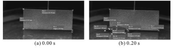 以鉑金板浸入至1%和25%氨水溶液的瞬時(shí)浸潤過程為例(見圖1、圖2),鉑金板底部與水平液面存在一定角度,經(jīng)HAS-Xviewer Ver軟件校準(zhǔn)測量,鉑金板浸入1%和25%氨水溶液過程中鉑金板底部與其倒影夾角分別為2.08,1.37°。