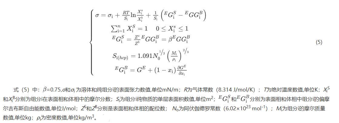 式(5)中:=0.75,σ和σi為溶體和純組分i的表面張力數值,單位mN/m;R為氣體常數(8.314 J/mol/K);T為絕對溫度數值,單位K;XiS和XiB分別為組分i在表面相和體相中的摩爾分數;Si為組分i純物質的單層表面積數值,單位m2;分別為表面相和體相中組分i的偏摩爾吉布斯自由能數值,單位J/mol;ZS和ZB分別是表面相和體相的配位數;No為阿伏伽德羅常數(6.02×1023 mol-1);Mi為組分i的摩爾質量數值,單位kg;ρi為密度數值,單位kg/m3。
