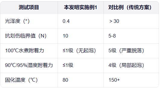 失效分析:對比例2(高羥樹脂<5份)因交聯密度不足,抗劃傷性能僅5N;對比例5(純高羥樹脂)因未反應羥基殘留,水煮后附著力驟降。本發明通過樹脂配比精準控制,兼顧啞光需求與力學性能。