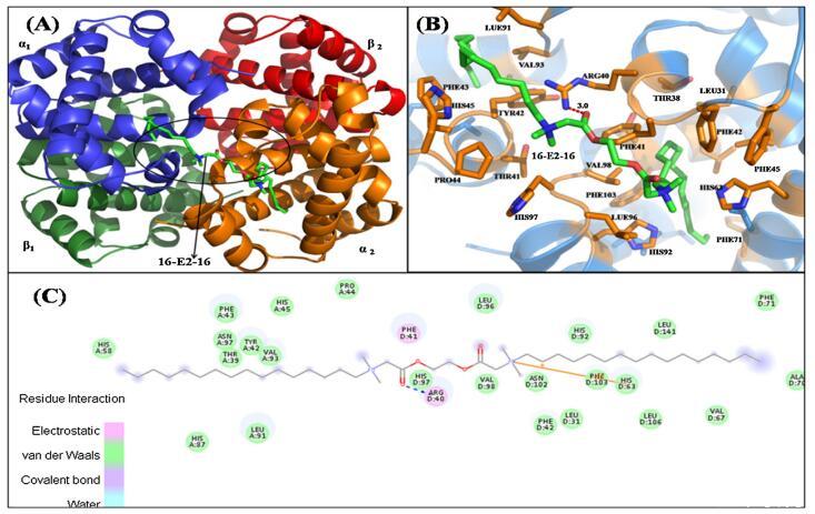 圖 6. 具有 16-E2-16 的 Hb 結(jié)構(gòu)示意圖。 (A) Hb-16-E2-16 的結(jié)構(gòu)。 Hb 的亞單位用不同的顏色表示。 配體 16-E2-16 是 以棍子為代表。 (B) 距??康?16-E2-16(綠色)5? 范圍內(nèi) Hb 的周圍氨基酸殘基(橙色)。 (C) Hb/16-E2-16 相互作用的二維表示。 (為了 對圖例中顏色參考的解釋,讀者可參考本文的網(wǎng)絡(luò)版本。)