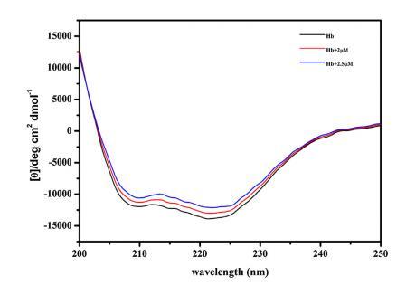 進(jìn)行CD以進(jìn)一步確認(rèn)構(gòu)象變化 由 16-E2-16 引起的 Hb,從而允許進(jìn)一步評估 Hb 和 16-E2-16 之間的相互作用。 圖 5 顯示了 不存在和存在 16-E2-16 時 Hb 的 CD 光譜。 光盤 Hb 的光譜在 208 nm 和 222 nm 處顯示兩個負(fù)最小值, 蛋白質(zhì)α-螺旋結(jié)構(gòu)的特征。 16-E2-16 光學(xué)不活動不顯示任何信號。 在場 在 16-E2-16 中,Hb 的負(fù)橢圓度降低,表明 可能形成 Hb/16-E2-16 復(fù)合物 [68]。 α-螺旋 計算了 Hb 及其與 16-E2-16 (2 μM) 復(fù)合物的百分比,發(fā)現(xiàn)分別為 53% 和 47%。 進(jìn)一步降低 在更高濃度的 16-E2-16 (2.5 μM) 存在下達(dá)到 44% 表明 Hb 的 α-螺旋含量明顯降低。 因此, CD 結(jié)果表明存在 16-E2-16 變化 Hb 的二級結(jié)構(gòu)與我們的 計算結(jié)果。