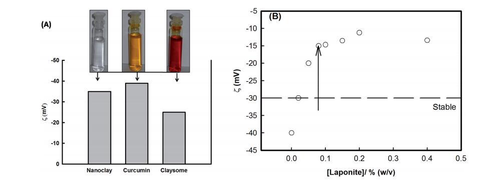 使用電泳法測(cè)量核殼姜黃素納米顆粒表面的靜電電位(zeta電位)(圖3(A))。值得注意的是,姜黃素和納米粘土均受臨界平衡斥力的控制,而不考慮姜黃素和納米粘土在界面處具有相同極性(負(fù))的zeta電位。關(guān)于復(fù)雜系統(tǒng)中負(fù)責(zé)穩(wěn)定性的不同力的更多細(xì)節(jié)將在后面的章節(jié)中進(jìn)行理論討論。此外,還測(cè)量了分散體的zeta電位,作為室溫下納米粘土濃度的函數(shù)。該電位隨著系統(tǒng)中納米粘土濃度的增加而增加(圖3(B))。最初,當(dāng)納米粘土濃度較低時(shí),電暈較薄,這有利于形成穩(wěn)定的粘粒組裝體,這進(jìn)一步得到較高zeta電位值的支持。隨著納米粘土濃度的增加,電暈尺寸增加(>100nm),zeta電位也發(fā)生了同樣的情況,這反過(guò)來(lái)又在復(fù)雜系統(tǒng)中產(chǎn)生了不穩(wěn)定性。