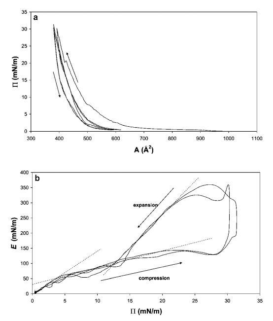 藜蘆皂甙??~皂苷的壓縮曲線如圖6所示。該皂甙在拐點(diǎn)處顯示出非常高的表面壓力,最大表面壓力為45 mN m-1。此外,皂甙表現(xiàn)出很寬的遲滯回線。從E–P曲線推斷出斜率為4.3,觀察到E中出現(xiàn)2個(gè)平滑的峰,這可能表明界面中存在相變,從皂甙的相對拉長的疏水區(qū)域判斷。27當(dāng)屏障方向逆轉(zhuǎn)時(shí),觀察到E中存在較大的超調(diào),表明膜破裂,類似于HFBII。