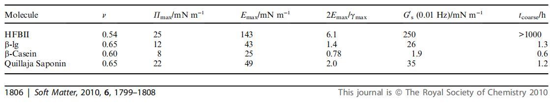 當(dāng)我們現(xiàn)在再次考慮表1中的2Emax/gmax比率時(shí),很明顯HFBII超過了5的值,這表明這將穩(wěn)定泡沫,防止收縮。 根據(jù)Kloek等人的說法,對于b-乳球蛋白和皂甙,我們報(bào)告的值介于1和2之間,表明氣泡收縮延遲,但沒有完全停止。2食品蛋白質(zhì)通常屬于這種狀態(tài),對歧化過程的抵抗力相對較小。10最后, 根據(jù)這個(gè)比率,b-酪蛋白根本無法抵消氣泡收縮,因?yàn)?Emax/gmax<1,這是主要的吉布斯標(biāo)準(zhǔn)。