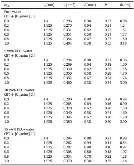 表5在純水中以及在T=298.15 K下存在不同體積百分比的DEG+水二元混合物時,純CET、[C10min][Cl]和混合物CET+[C10min][Cl]的有效疏水鏈長度(lc)、疏水鏈體積(v)、極性頭基團表面積(A)、填充參數(P)和半徑(R)的值。