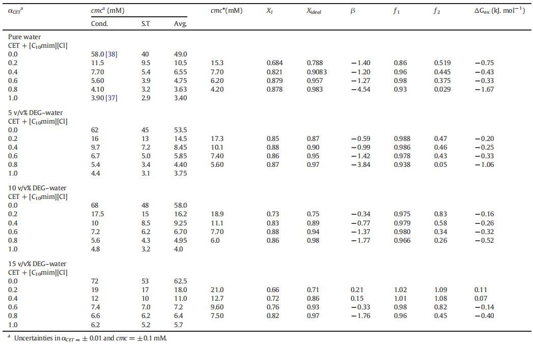 表1列出了根據式(3)計算的純水中的β值。在存在不同體積百分比的二甘醇-水二元溶液的情況下,也測定了類似值,如表1所示。β的值可以是正(拮抗作用)、負(協同作用)或零(組分之間無相互作用)[51]。此外,β的負值意味著IL和表面活性劑之間的吸引力大于單個組分之間的吸引力。從表1可以看出,對于所有二元混合物,β值均為負值,然而,隨著DEG的量從5增加到15 v/v%,負值減小,令人驚訝的是,對于αCET=0.2和0.4,β值均為正值。β的負值通常是混合膠束中有利相互作用的原因,然而正值意味著不利相互作用[53–54]。因此,從表1中可以看出,作為膠束形成主要力量的協同作用隨著DEG量的增加而減少。這種下降的原因可能是DEG的結構破壞能力導致單體之間的疏水相互作用減少,從而降低了它們的協同作用。