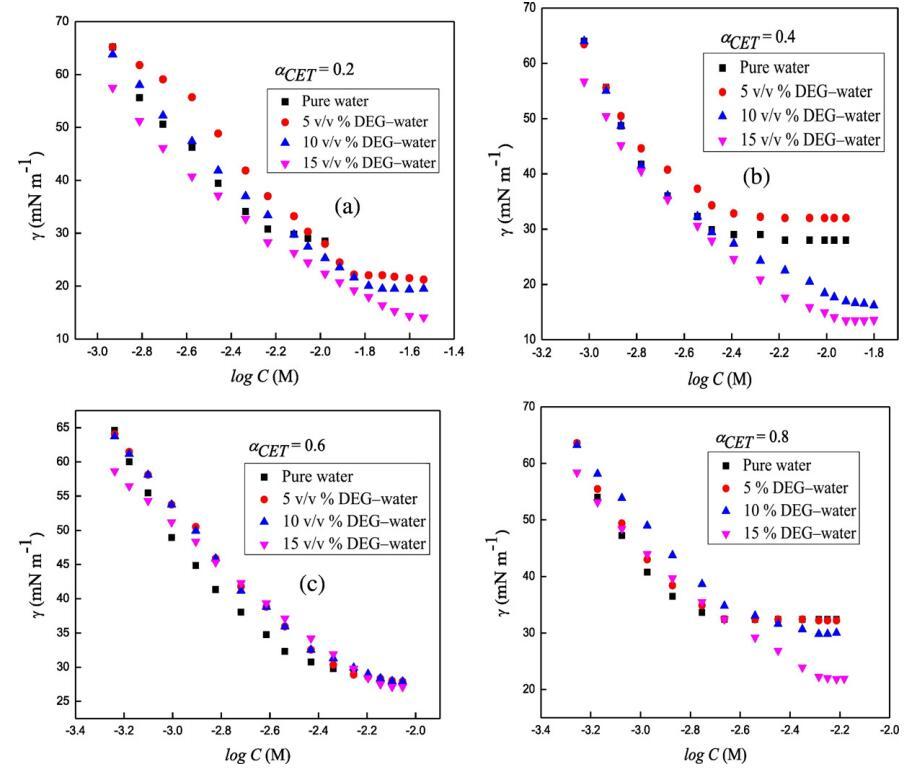 圖2.在T=298.15 K時,二甘醇-水二元混合物的不同體積百分比下,混合體系的表面張力,γ與對數[濃度]的關系曲線,CET+[C10min][Cl](a)αCET=0.2(b)αCET=0.4,(c)αCET=0.6和(d)αCET=0.8。